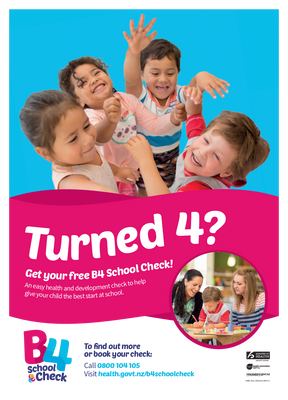 An A3 poster in English promoting the final Well Child Tamariki Ora B4 School health check in the year before children start school. Contains Auckland-specific contact details and so is only intended for use in the three Auckland-region DHB catchment areas.