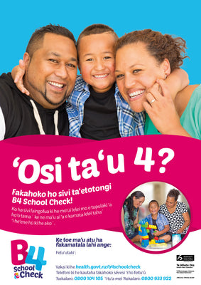 An A3 poster in Tongan promoting the final Well Child Tamariki Ora B4 School health check in the year before children start school. This resource is intended for use in all regions and contains information about how to contact a local provider in your area.