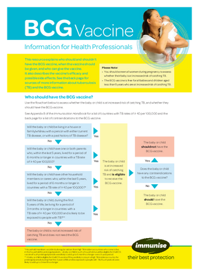This resource explains who should and shouldn’t have the BCG vaccine, when the vaccine should be given, and who can give the vaccine. It also describes the vaccine's efficacy and possible side effects. See below for sources of more information about tuberculosis (TB) and the BCG vaccine.