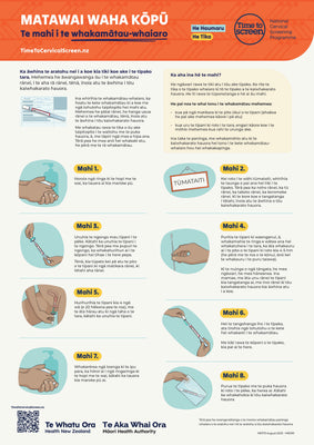Matawai waha kōpū: te mahi i te whakamātau-whaiaro Cervical screening: how to do the HPV self-test te reo Māori A4 portrait poster HE1173