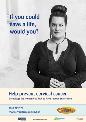 Poster in English promoting regular cervical smear tests. The woman in the photo is Māori.