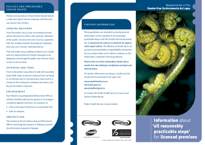 These guidelines are intended to provide general information on the standard of all reasonably practicable steps under the Smoke-Free Environments Act. It should not be used as a substitute for legal or other expert advice. The Ministry of Health does not accept any responsibility or legal liability whatsoever for any actions taken or not taken in reliance on the information contained in these guidelines.