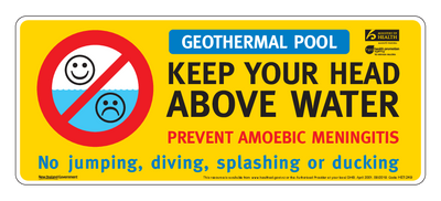 Sticker (290 mm x 120 mm) for indoor areas near geothermal pools to help prevent amoebic meningitis by keeping your head above water. Most meningitis is caused by bacteria or viruses, but amoebic meningitis is caused by an amoeba that lives in hot pools.