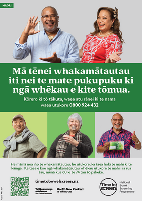 Poster in te reo Māori promoting the free National Bowel Screening Programme to eligible people aged 60–74.