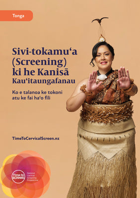 Fekumi ke lahi ange ‘a ho‘o ‘ilo ki he sivi tokamu‘a ‘o e kau‘itaungafanaú, ngaahi founga sivi ke ke fili mei ai, mo e taimi mo e feitu‘u ki ha‘o ‘apoinimeni, ‘aki ha‘o telefoni ta‘etotongi ki he 0800 729 729 pe a‘utonu ki he uepisaiti: TimeToCervicalScreen.nz -