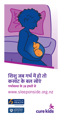 Gives information to inform pregnant women about how sleeping on her side in her 3rd trimester of pregnancy is proven to reduce the risk of stillbirth by half.