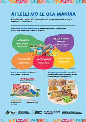 Pictorial in Samoan of the Pacific three food groups: Health and protective foods, building foods, and energy foods.