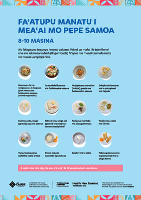 Meal ideas for Pacific babies and toddlers from 8 to 10 months old. Includes Pacific meal ideas for babies learning to eat, tailored to their age and stage. This resource was co-produced with the Pacific community and uses Pasifika design.