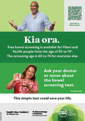 This card is for clinic receptions or other public areas. It supports the promotion of bowel screening in primary care, encouraging people to ask their doctor or nurse about the bowel screening test. This is for districts that offer an earlier starting age of 50 for Māori and Pacific People, along with the standard bowel screening age range of 60-74 years for others.