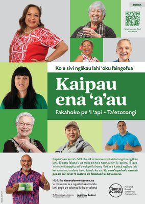 Bowel screening campaign poster, A3 size in Tongan. Posters can be used by anyone who wants to support and promote the bowel screening programme.