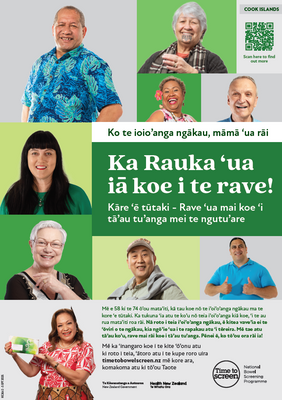 Bowel screening campaign posters, A3 size in English, Cook Islands Māori. Posters can be used by anyone who wants to support and promote the bowel screening programme.