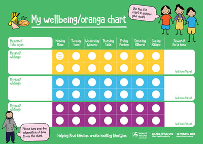 This wellbeing/oranga chart will support you and your child to create healthy goals and work towards achieving them.