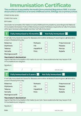 Children need an immunisation certificate to show if they are fully immunised or not. The vaccinator will sign the certificate when giving the 15 month immunisations and again after the immunisations prior to school entry. If you choose against immunisation, the certificate can be signed by the vaccinator at any time.
