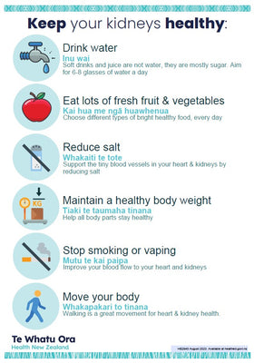 Bright images with minimal wording illustrate how to maintain and improve kidney health. General adult information, for use by anyone to promote and support kidney health. A3 & A4 posters/leaflets. English and te reo Māori.
