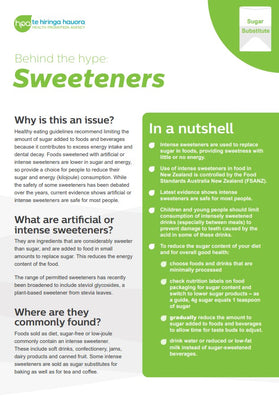 The two-page Behind the Hype information sheets contain evidence-based advice to help you provide clear consistent information to consumers. Want to know what sweeteners are and why they're added to food? This Behind the Hype information sheet will take some of the mystery out of artificial and intense sweeteners.