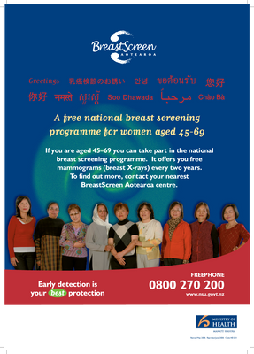 Screening identifies people who may be at increased risk of a disease or a condition. New Zealand’s national programmes include pregnancy and newborn screenings, breast screening, cervical screening, and bowel screening. More information is available from the National Screening Unit, a unit of the Ministry of Health.
