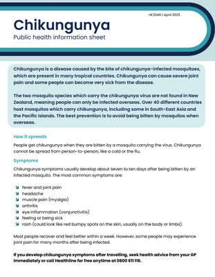 If you develop chikungunya symptoms after travelling, seek health advice from your GP immediately or call Healthline for free anytime at 0800 611 116.