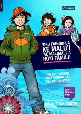 Web-only explanation in Tongan of the free basic oral health service available from birth until the eighteenth birthday, together with advice about cleaning and looking after teeth, and about healthy food for healthy teeth.