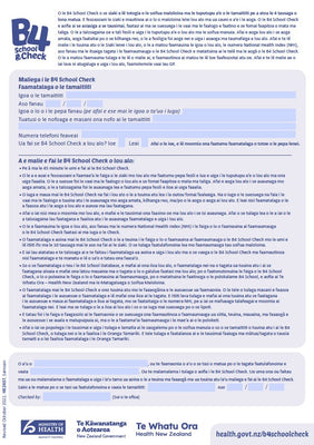 Consent form in Samoan for parents and caregivers to give consent for the B4 School check – the final Well Child health check in the year before children start school. To be given out by Well Child providers along with the information pamphlet.