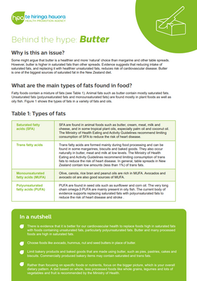 Some argue that butter is a healthier and more 'natural' choice than margarine and other table spreads. However, butter is high in saturated fats and there is evidence that this is not good for our cardiovascular health. This information sheet explains the different types of dietary fat and gives practical advice to help make informed dietary choices.