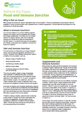 Many people are looking for ways to strengthen their immune system. There is a widespread misconception that it is possible to boost immune function with a specific food or nutrition supplement, and this can detract from the importance of overall diet quality. This Behind the Hype fact sheet provides information and advice about diet, nutrition supplements and how best to support immune function.