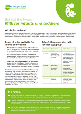 Breastfeeding provides optimum nutrition for infants. However, for parents who are not breastfeeding, there may be confusion about which milk to provide to their infants and toddlers at each age and stage. This information sheet explains which milks are recommended, the nutritional content of different formula milks, and drinks to avoid for this age group.