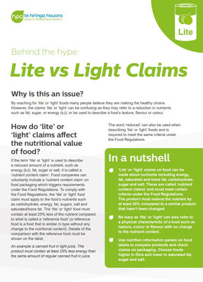 The two-page Behind the Hype information sheets contain evidence-based advice to help you provide clear consistent information to consumers. Foods labelled as 'lite' or 'light' can confuse people looking for the healthier option. This information sheet explains what these claims mean and how to be sure you're making the healthier choice.