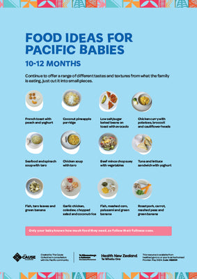 Meal ideas for Pacific babies and toddlers from 10 to 12 months old. Includes Pacific meal ideas for babies learning to eat, tailored to their age and stage. This resource was co-produced with the Pacific community and uses Pasifika design.