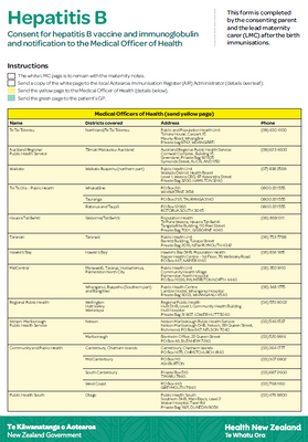 Consent form for hepatitis B vaccination and hepatitis B immunoglobulin, including also a notification to the Medical Officer of Health, for use by health professionals. (This is a triplicate form). HE1446