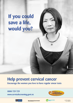 Poster in English promoting regular cervical smears. The woman in the photo is Chinese.