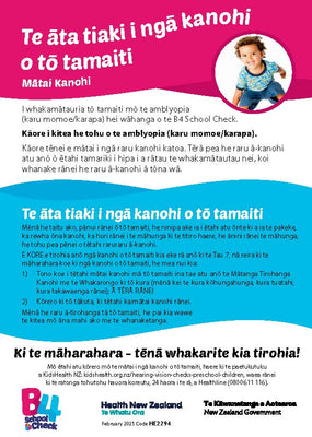 Te āta tiaki i ngā kanohi o tō tamaiti. Web-only information in te reo Māori for vision technicians to give to parents/caregivers when the child has passed vision screening for amblyopia (lazy eye), as part of routine Well Child health checks.