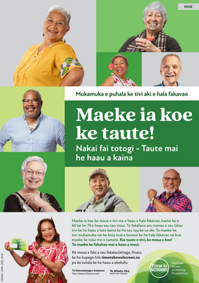 National bowel screening campaign posters, A3 size in Niuean. Posters can be used by anyone who wants to support and promote the bowel screening programme.
