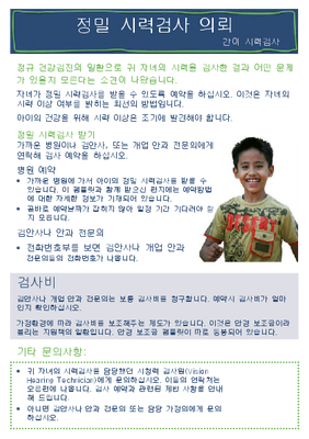 Web-only information in Korean for vision technicians to give to parents and caregivers, when screening for ambylopia (lazy eye) as part of routine Well Child health checks indicates the need for further assessment.