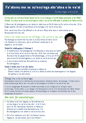 Mo nisi fa‘amatalaga e uiga i le su‘esu‘eina o le va‘ai a tamaiti, pe e te mana‘o e lolomi le tusitusiga lenei, asiasi ane i le Upega o Feso‘ota‘iga a le Matagaluega o le Soifua Maloloina: http://www.health.govt.nz/your-health/services-and-support/health-care-services/well-child-tamariki-ora/about-b4-school-check po‘o lou vili foi o le numera e le totogia e 24 itula mo fautuaga tau i le soifua malōlōina, o le Healthline (0800 611 116).