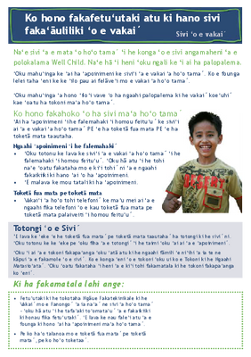Ki ha fakamatala lahi ange felāve‘i mo hono sivi ‘o e vakai ‘a e fānau´, pe ko ha‘o fiema‘u atu ha tatau ‘o e ki‘i tohi´ ni, vakai ki he uepisaiti ‘a e Potungāue Mo‘ui´ ‘i he: http://www.health.govt.nz/your-health/services-and-support/health-care-services/well-child-tamariki-ora/about-b4-school-check pe telefoni ki he fika telefoni ta‘etotongi ki he mo‘ui lelei´, (0800 611 116).