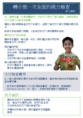 Web-only information in traditional Chinese for vision technicians to give to parents and caregivers, when screening for ambylopia (lazy eye) as part of routine Well Child health checks indicates the need for further assessment.