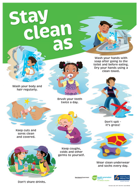 Cartoon characters promoting key messages on germs, infections, washing, and basic hygiene (for school use).