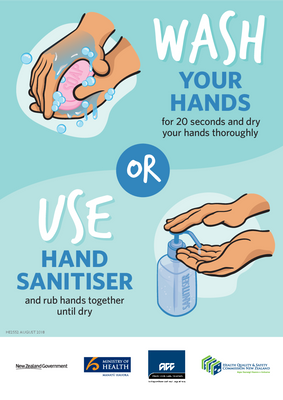 This A3 poster highlights the importance of good hand hygiene, by showing viewers how to correctly wash and dry their hands or use hand sanitiser. It is available in English, Māori, Hindi, Samoan, Simplified Chinese and Tongan.