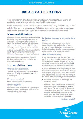 This fact sheet describes benign breast condition of calcifications or small areas of calcium in the breast. These are common and, in most cases, harmless. If calcifications are detected during a mammogram, the woman will be recalled for assessment. For BreastScreen Aotearoa professionals to use in the programme.